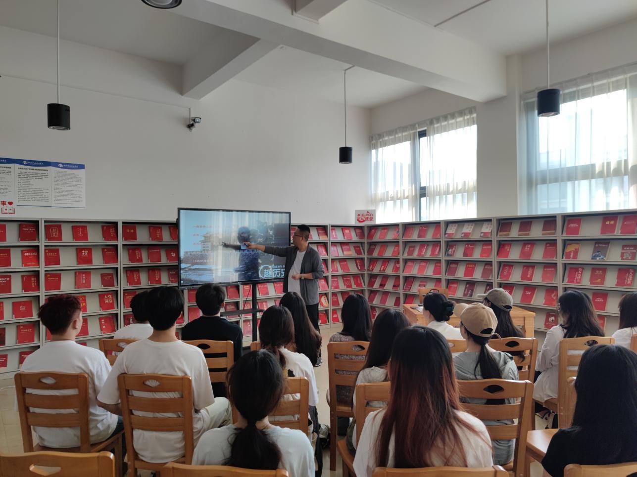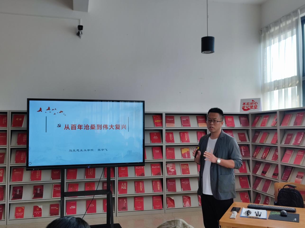 5月10日下午5:00,张宇飞老师在图书馆三楼“红色阅读角” 举办红色知识专题讲座,本期讲座的主题是从百年沧桑到大国崛起。(张新玲摄)