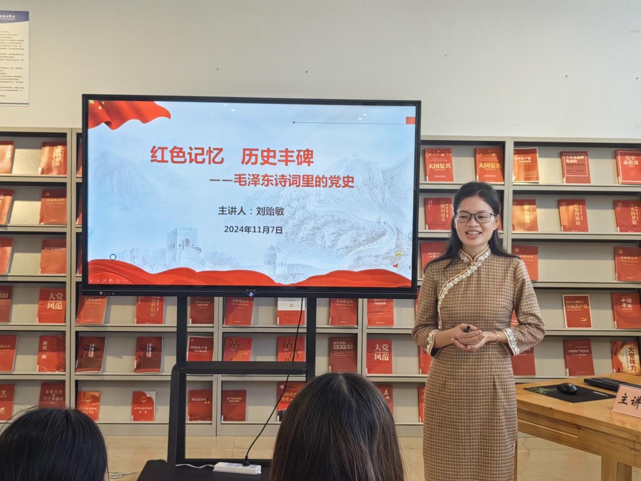 11月7日下午5:00,刘贻敏老师在图书馆三楼“红色阅读角” 举办红色知识专题讲座,本期讲座的主题是红色记忆 历史丰碑——毛泽东诗词里的党史。我校舞蹈学院积极分子到场聆听讲座并参与互动,氛围良好,同学们纷纷表示受益匪浅。(张家梅摄)