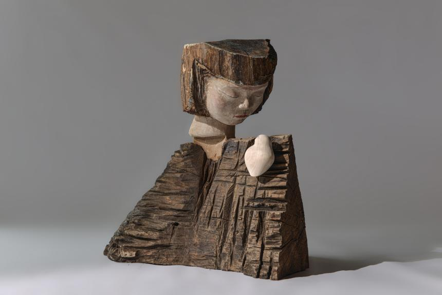 少女低眉,鸟栖于怀。木纹流淌间,刀锋凿下并非形体,人鸟相望,翎羽与衣褶在虚实中互生。刻意模糊的边界,《齐物论》的注脚:谁在凝望?谁被凝望?若蝶梦庄周,则此处木雕不过天地一瞬的残影,存留“大我”与“小我”未辨时的震颤。