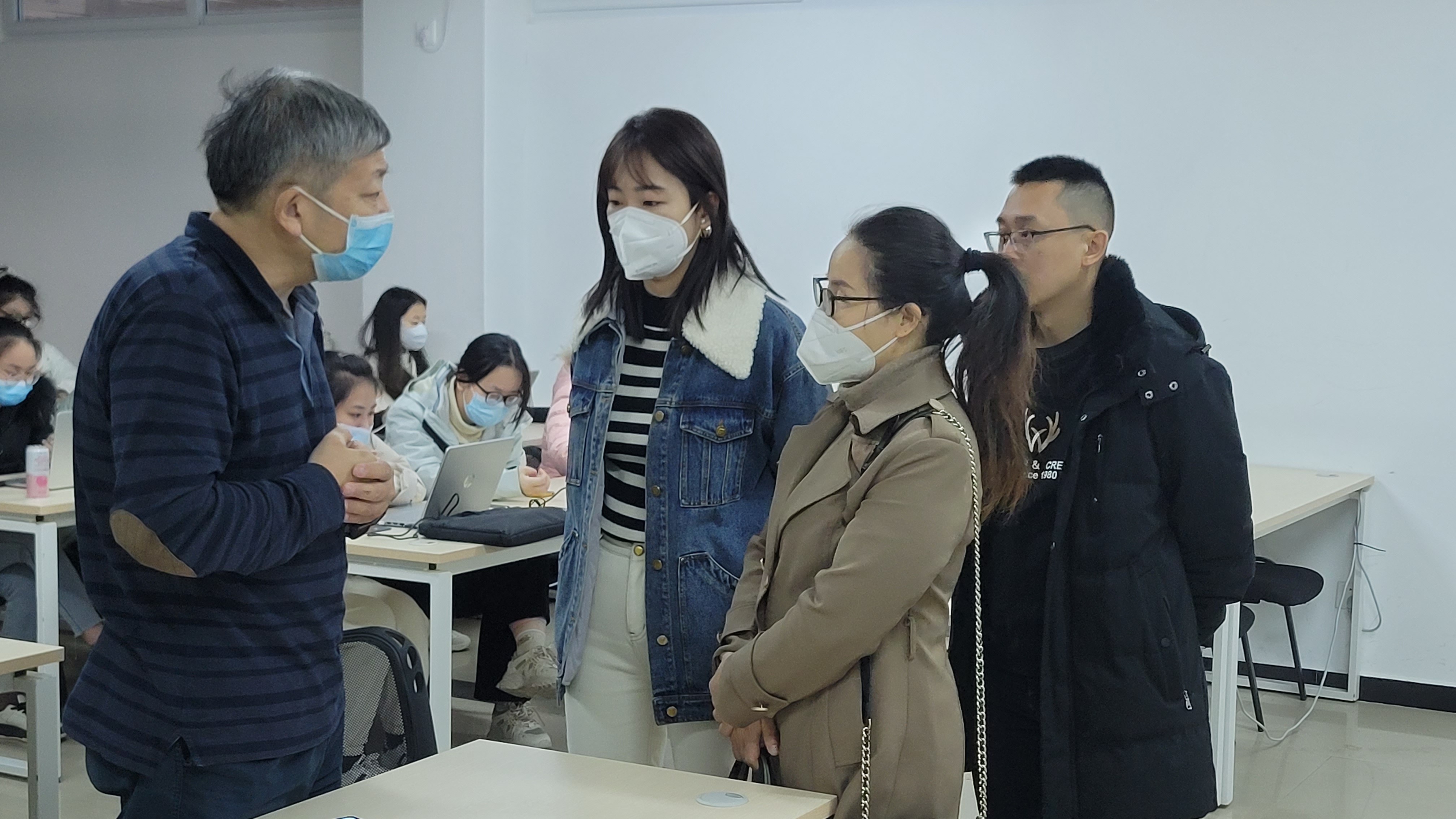 考察组老师将一份份就业指导材料分发学生们手上,与学生们亲切交谈,询问学生的就业状况和学习疑问。