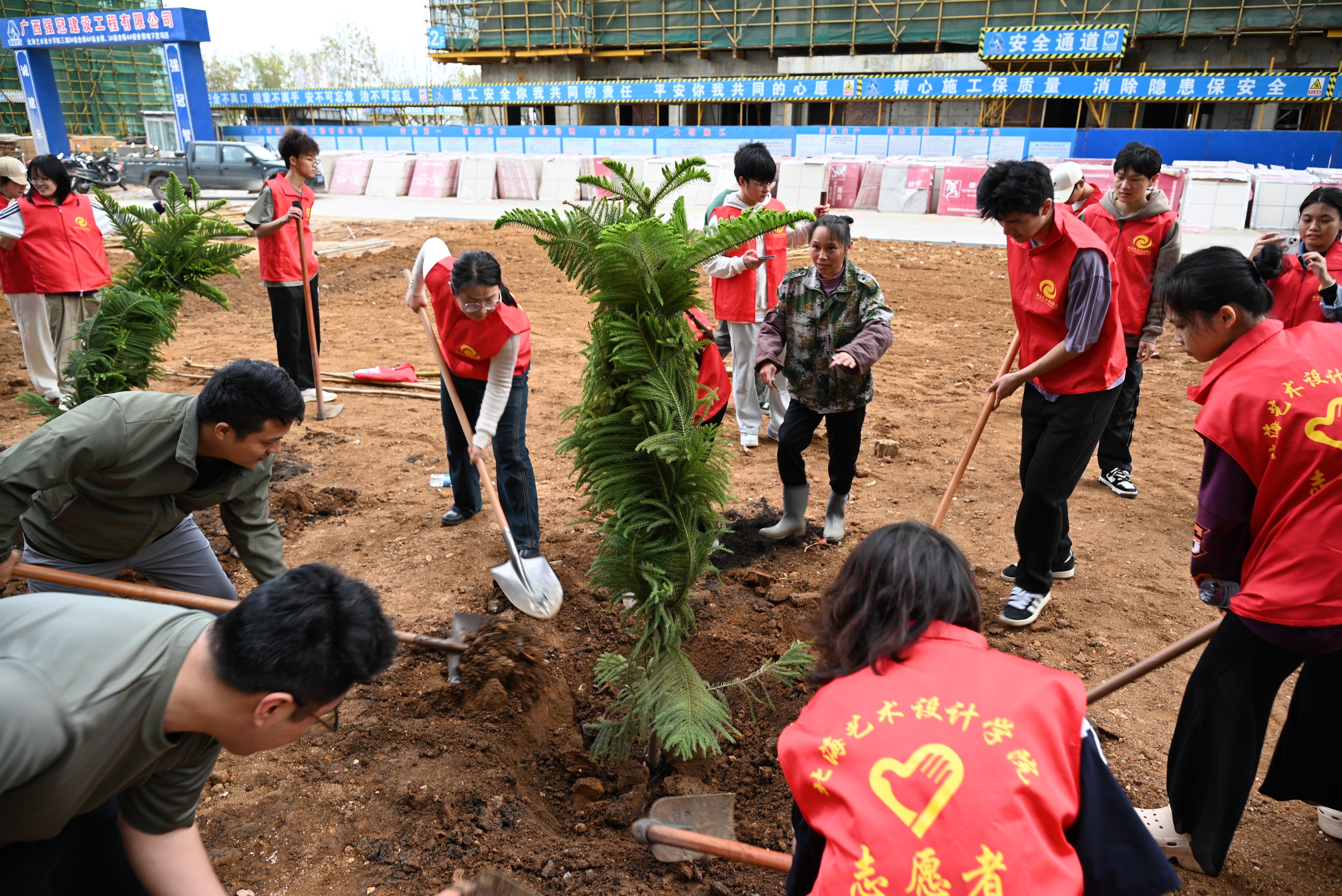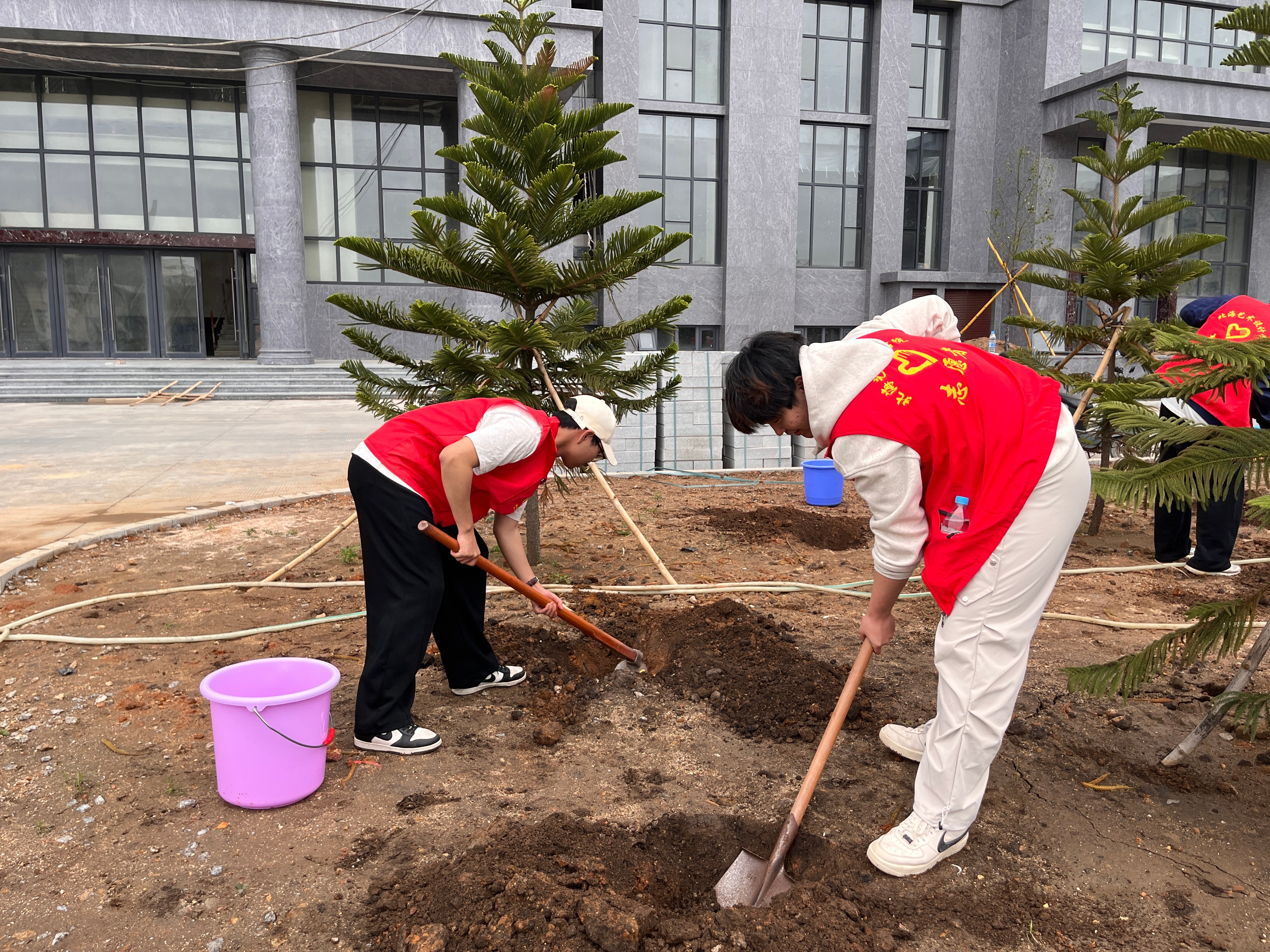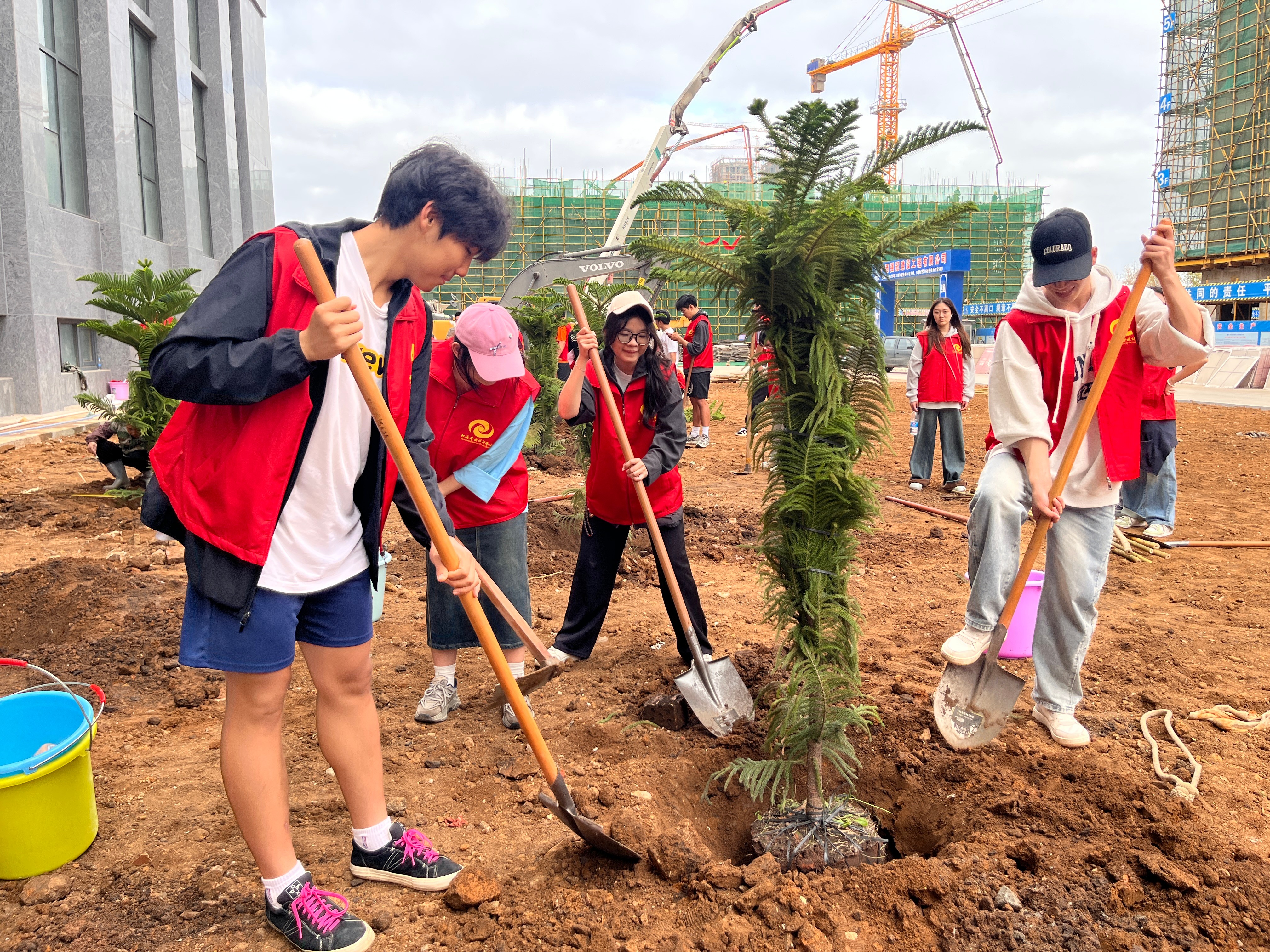 志愿者们怀揣着热情与期待,手持工具迅速投入热火朝天的植树活动中。挥锹挖坑,放苗入坑,小心扶正,填土夯实,提桶浇水,他们分工协作,默契配合,井然有序,合力完成每一道植树工序。