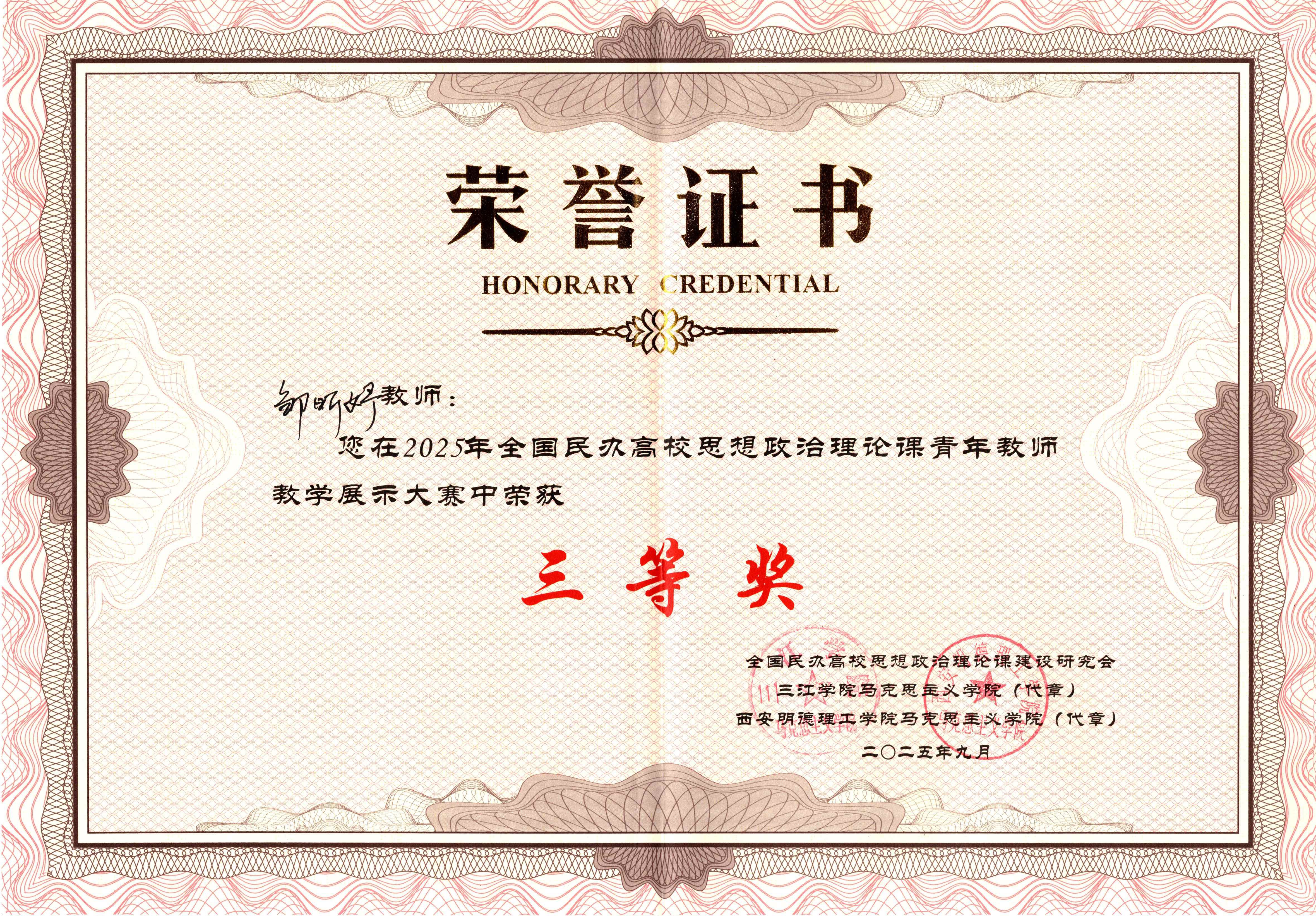 喜报:我院教师邹昕妤荣获2025年全国民办高校思想政治理论课青年教师教学展示大赛三等奖