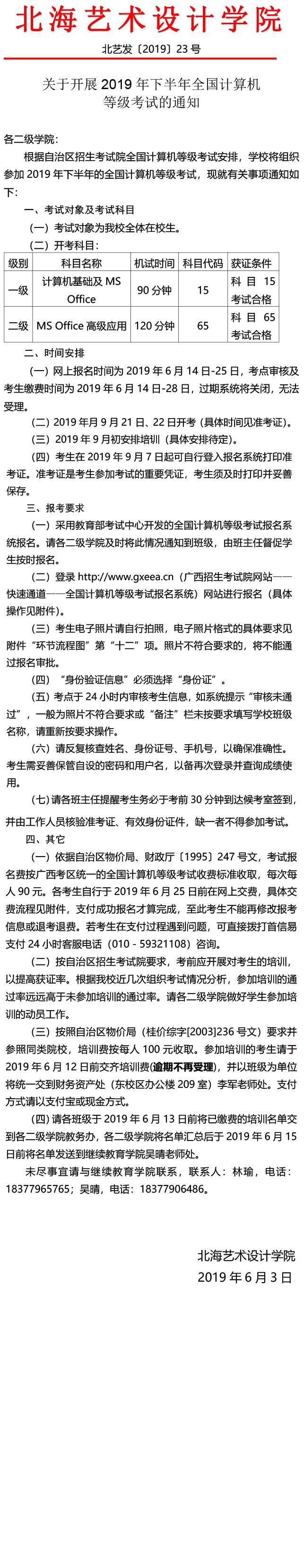 关于开展2019年下半年全国计算机等级考试的通知
