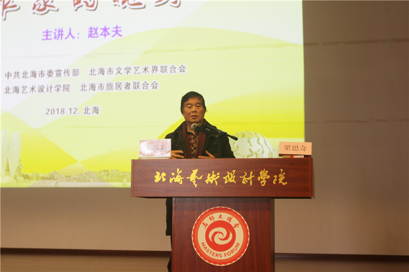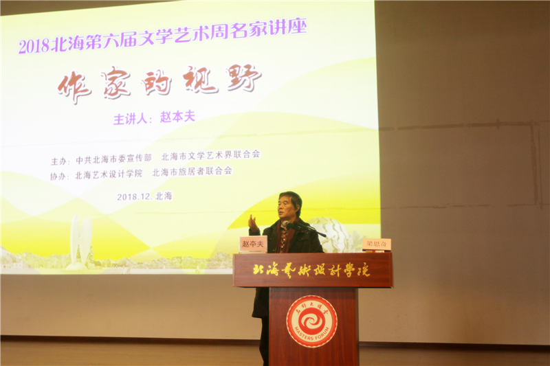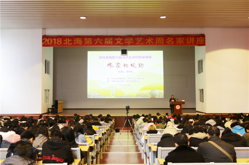 2018年12月14日北海第六届文学艺术周名家讲座于我校举行,上午九时在我校西校区大礼堂,中国作家协会主席团委员赵本夫先生为我校师生带来一场题为《作家的视野》的精彩讲座。广大师生现场聆听,众多文学爱好者及我校近700名师生与作家进行了互动交流。本次讲座由中共北海市委宣传部副部长梁思奇主持。