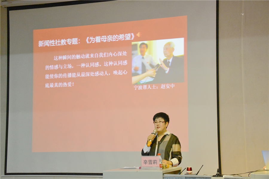 讲座开始时,辛教授与同学们分享了她近30年的工作经验和对播音主持行业的热爱,她认为播音不只是简单的传递声音,而是在广播真情、广播爱。辛教授通过从业以来的作品告诉同学们新闻背后的一些故事。作品《为着母亲的希望》、《采访罗南英的日子里》、《小丽的面人有颗心》、《跨越蓝色的梦想》、《寻找方大曾—两代记者穿越时空的对话》流露出对家乡的深情和对社会的热爱。反映出新闻不但是事件的真实,还是来自心灵的忠诚与情感的真实。