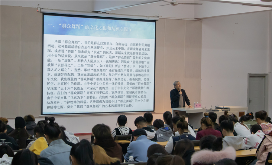 讲座过程中,于教授从新型城镇化进程中的群众舞蹈入手,讲解了群众舞蹈“人以群分”和“头领群舞”的现象,通过举例当下流行的社会广场舞,分析了群众舞蹈的发展历程和趋势。目前,新型城市中的群众舞蹈形成了两个新特征:一是以活动身体为主要功能,来弥补身体机能退化的缺憾;二是以追逐时尚为次要功能,在舞蹈中融入时尚潮流元素。