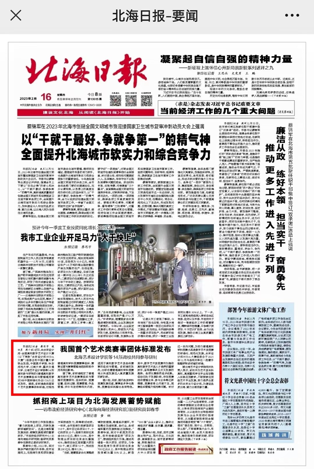 北海日报:我国首个艺术类赛事团体标准发布——北海艺术设计学院等14所高校共同参与研制