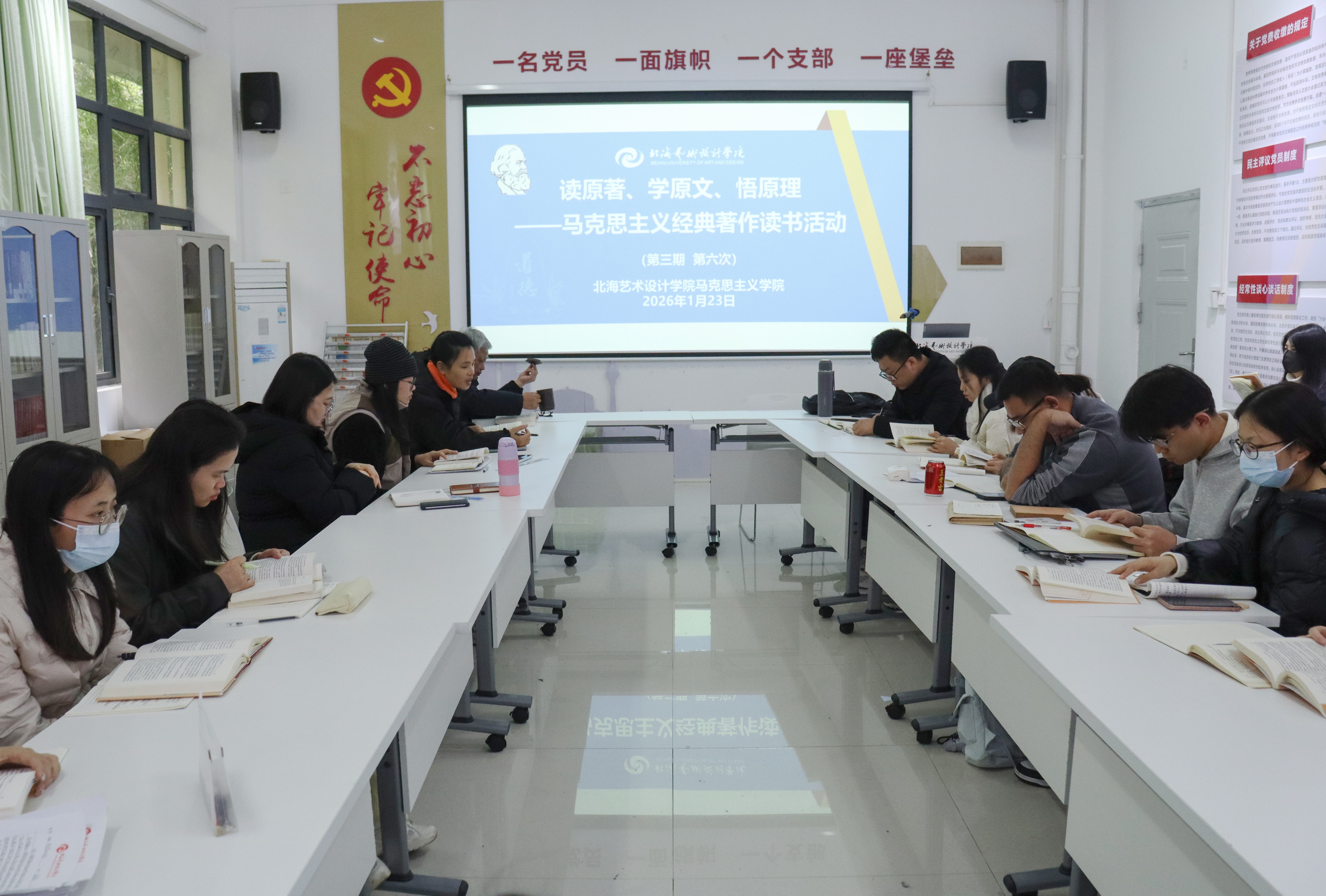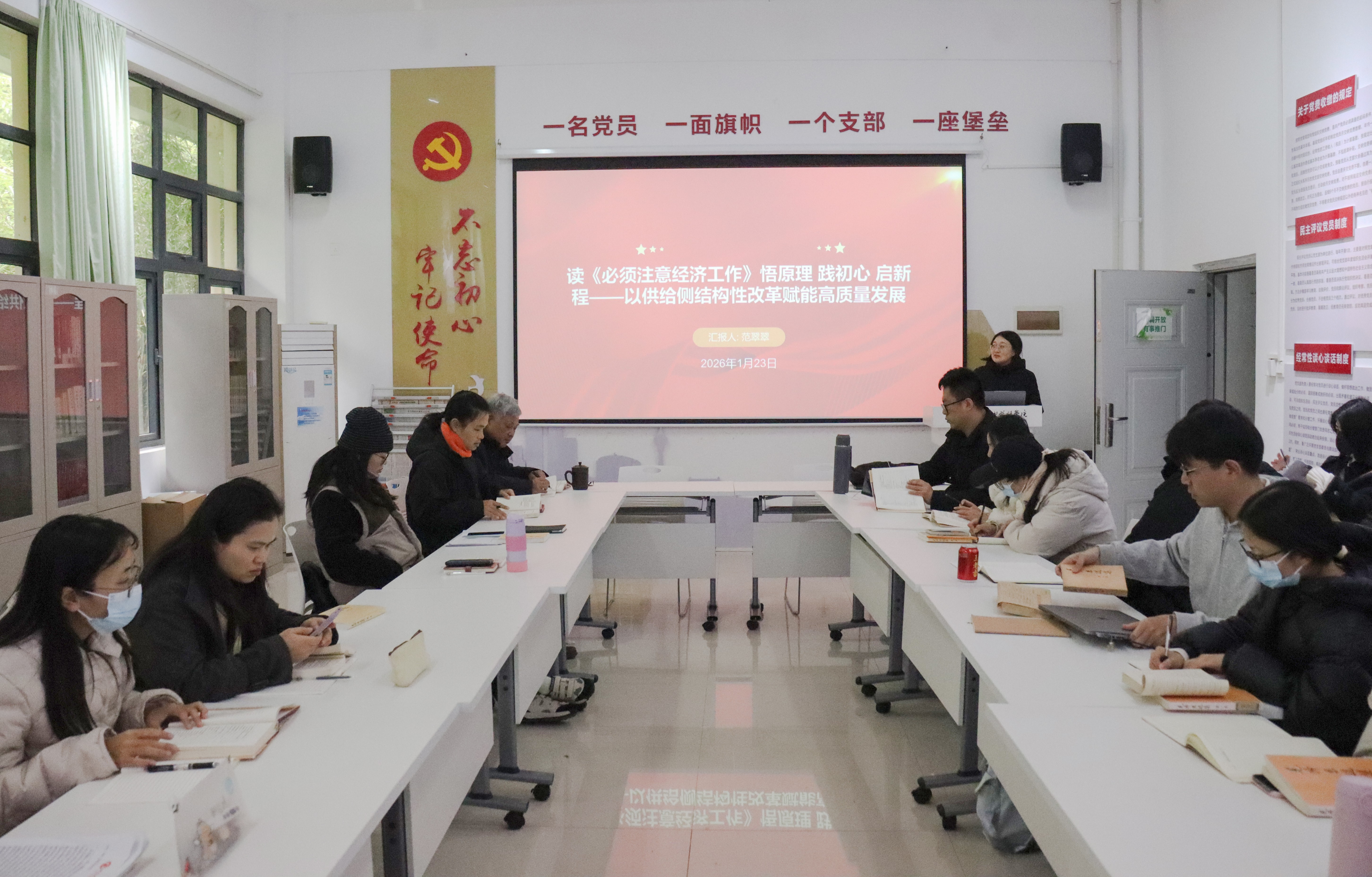 1月23日,马克思主义学院在西校区行政楼103红色驿站举行第三期马克思主义经典著作读书第六次活动。活动由马克思主义学院副院长张宇飞主持,马克思主义学院毛泽东思想和中国特色社会主义理论体系概论教研室主任范翠翠主讲《必须注意经济工作》,学院全体中青年教师参加活动。