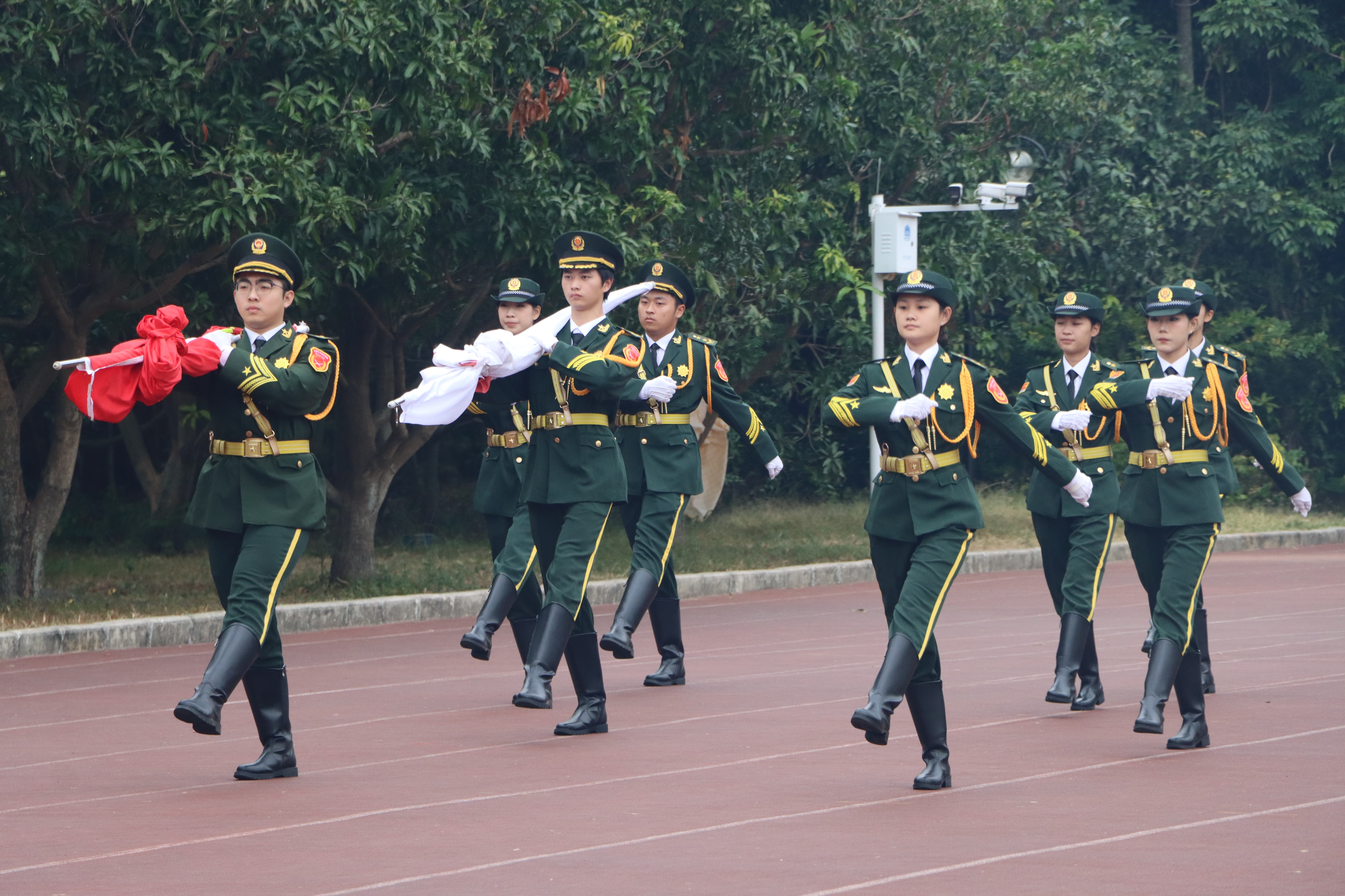 清晨,暖阳轻洒校园。国旗护卫队队员身着礼服手擎国旗,迈着铿锵正步从操场东侧走向升旗台,步伐整齐、脚步声铿锵。在场师生驻足而立,目光追随着耀眼的国旗。