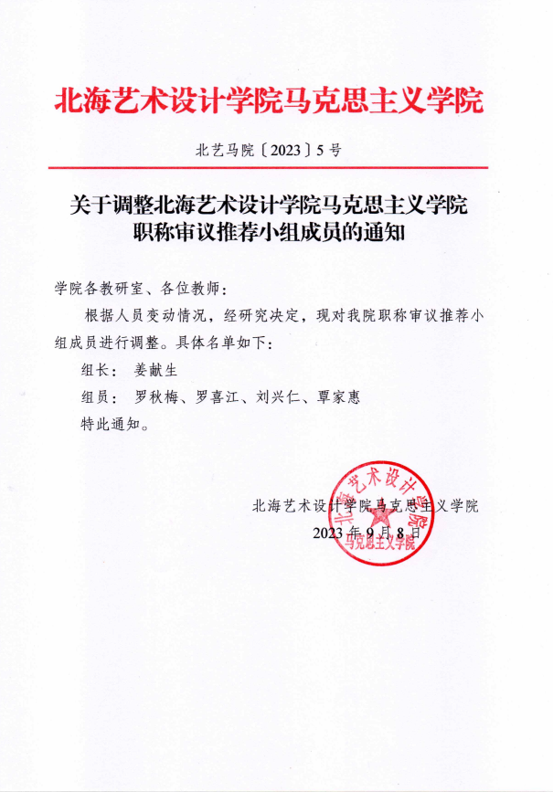 北艺马院〔2023〕5号 关于调整北海艺术设计学院马克思主义学院职称审议推荐小组成员的通知