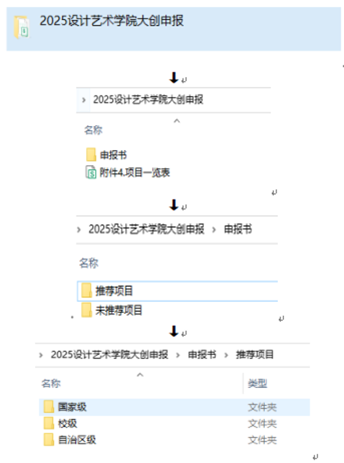 1.电子版:申报书(内含两个文件夹,分别以“推荐项目/未推荐项目”命名)、项目一览表。以上内容须置入1个文件夹内并压缩成1个Rar格式文件,文件夹命名:二级学院+2025年申报大创项目(例“设计艺术学院2025年申报大创项目”)。由各二级学院汇总后于2025年5月9日前发送至邮箱:bhyscxcy@163.com(不接收学生个人项目单独发到此邮箱)。二级学院文件夹压缩包层级如下: