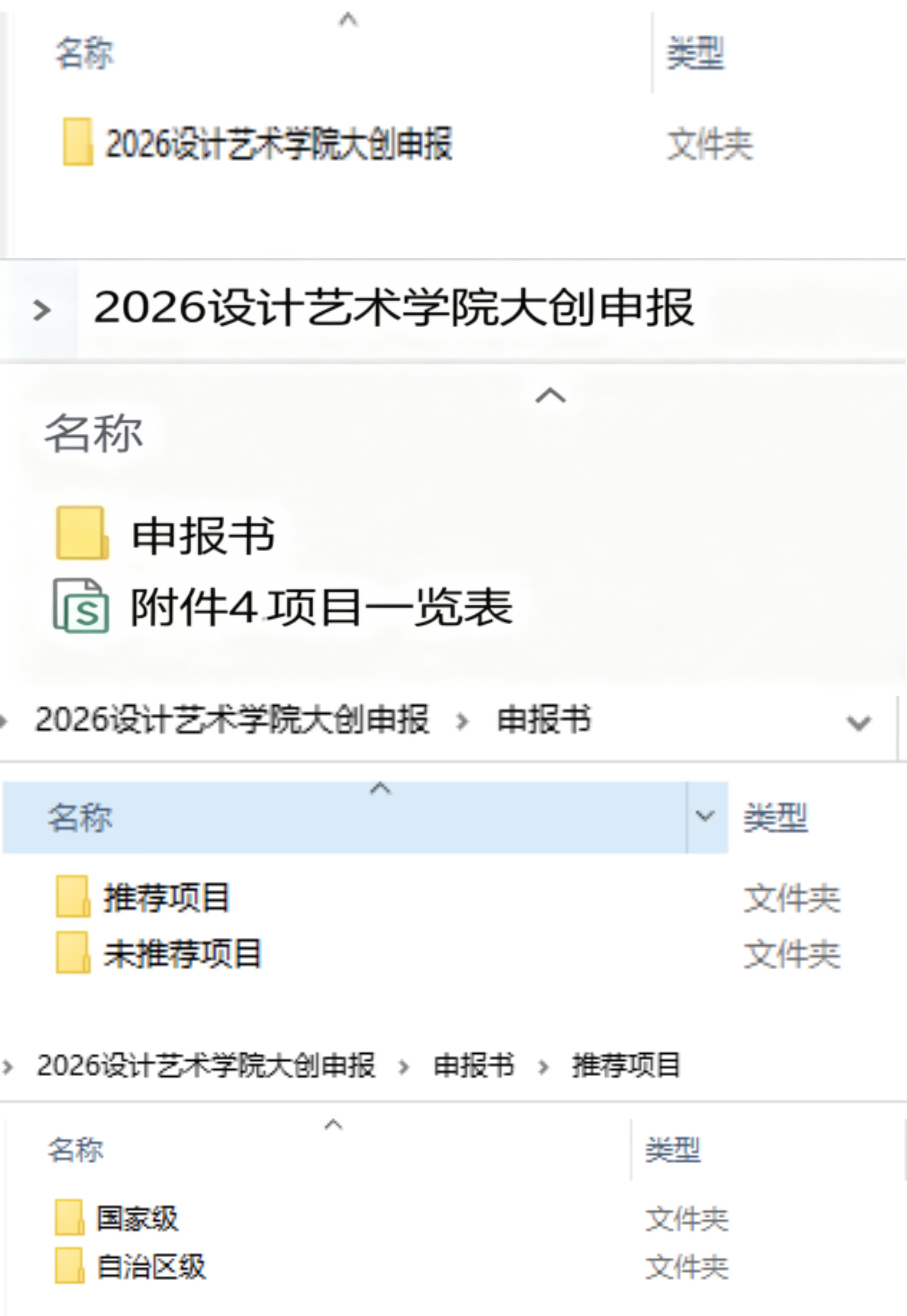 1.电子版:申报书(内含两个文件夹,分别以“推荐项目/未推荐项目”命名)、项目一览表。以上内容须置入1个文件夹内并压缩成1个Rar格式文件,文件夹命名:二级学院+2026年申报大创项目(例“设计艺术学院2026年申报大创项目”)。由各二级学院汇总后于2026年5月25日前发送至邮箱:bhyscxcy@163.com(请打包发送,不接收学生个人项目单独发到此邮箱)。二级学院文件夹压缩包层级如下: