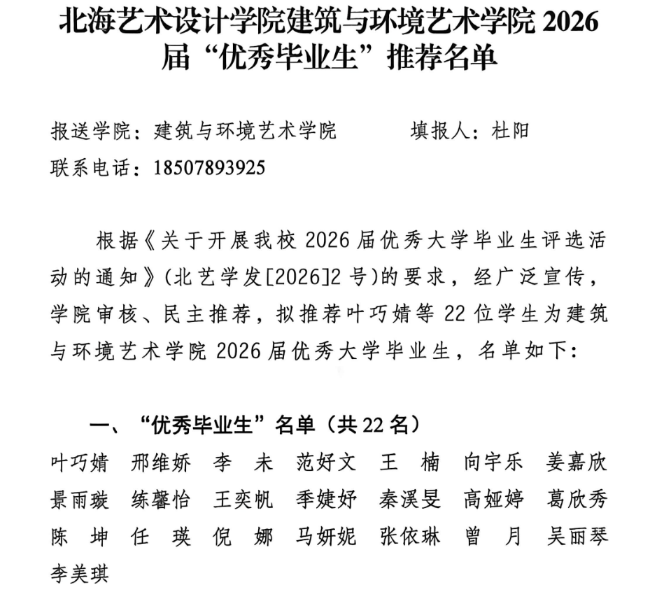 根据《关于开展我校2026届优秀大学毕业生评选活动的通知》(北艺学发[2026]2号)的要求,经广泛宣传,学院审核、民主推荐,拟推荐叶巧婧等22位学生为建筑与环境艺术学院2026届优秀大学毕业生,名单如下: