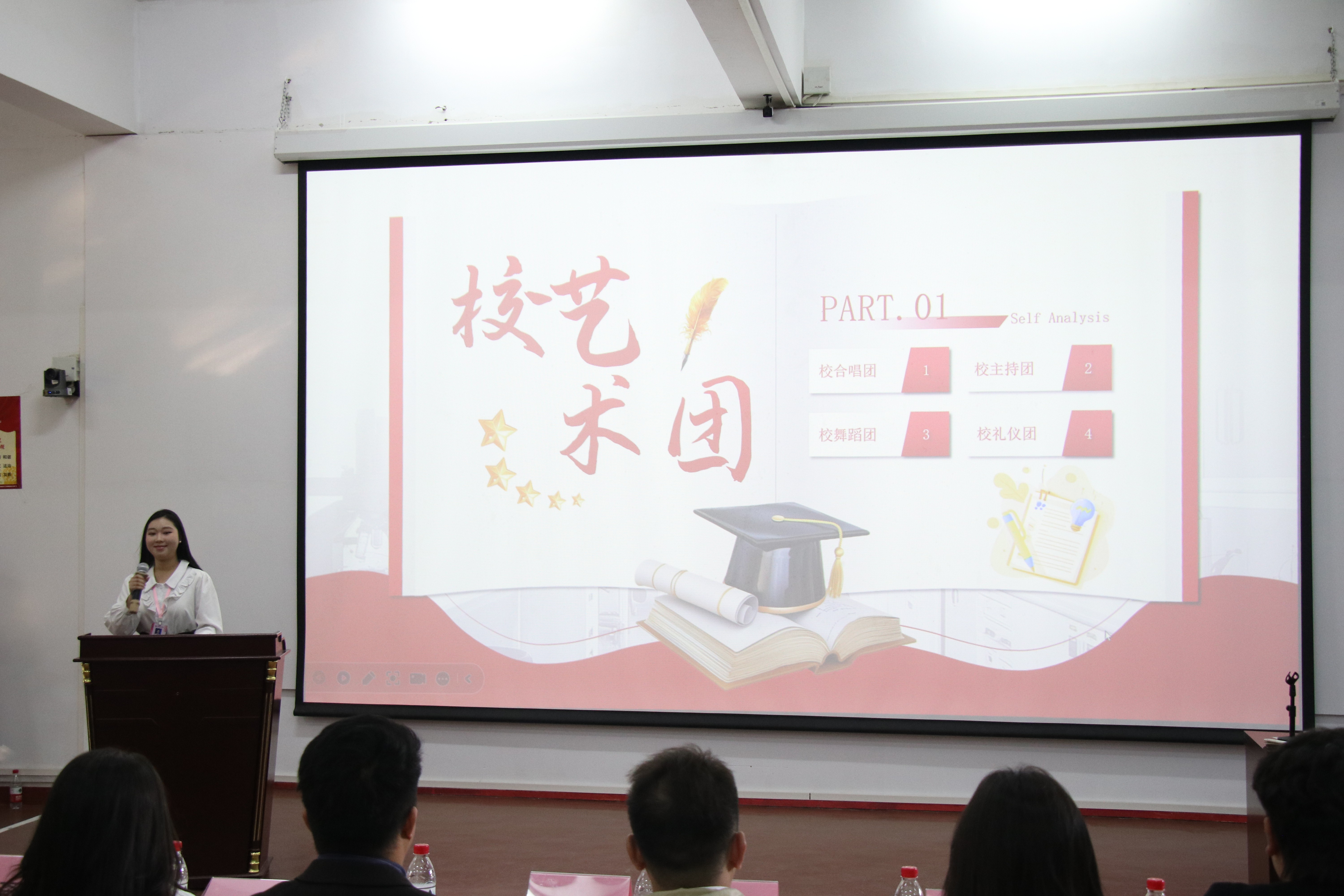 艺术团负责人杨焰菲分别介绍了合唱团、主持团、舞蹈团和礼仪团的成果与不足。她表示,艺术团在迎新晚会、十佳歌手、元旦晚会等活动中表现优异,但在考勤、成员态度和排练效率等方面仍需改进。未来,艺术团将加强考勤管理,提升基本功训练,增强团队合作。
