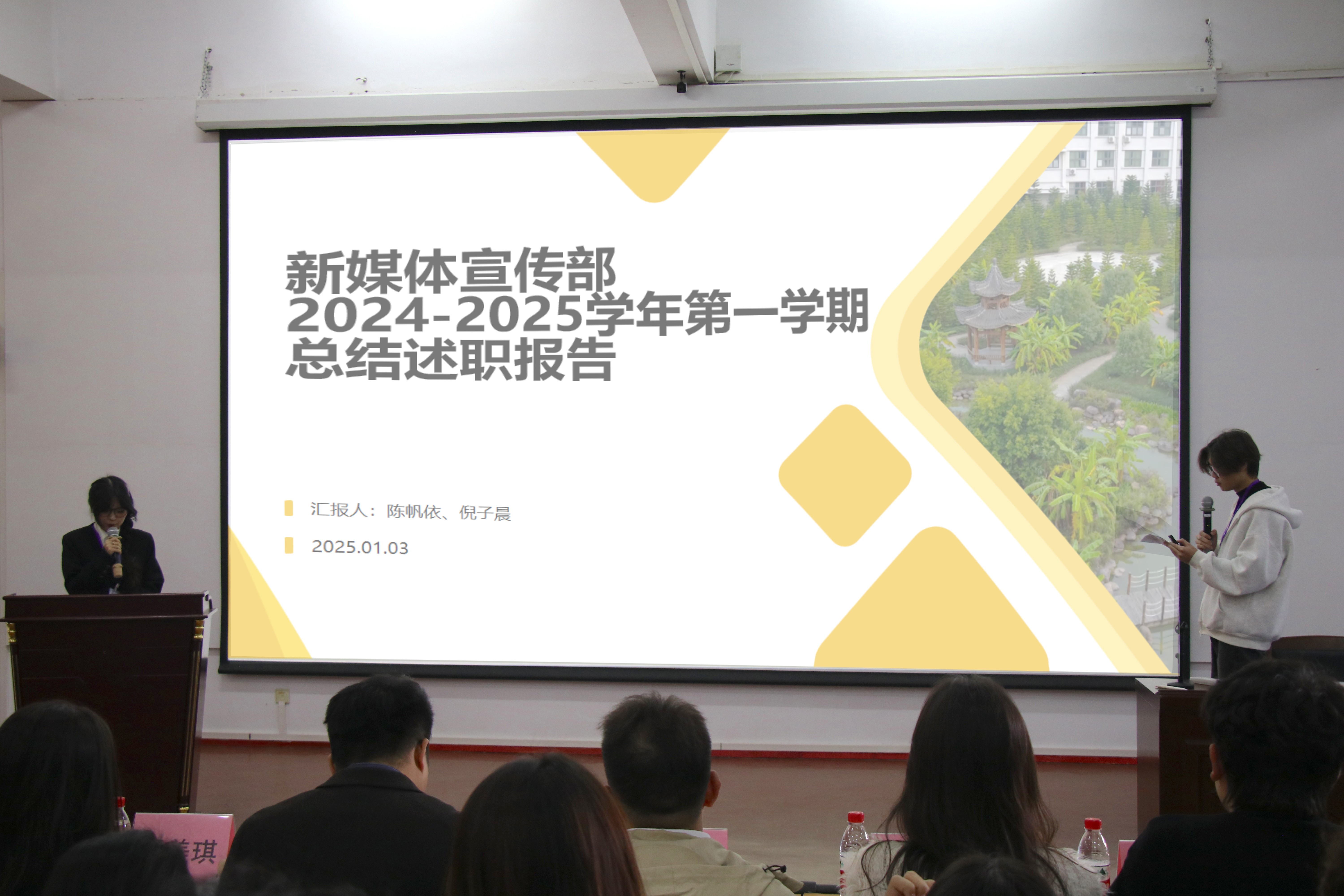 新媒体宣传部负责人陈帆依、倪子晨共同汇报了本学期的工作情况。从工作成果、各部门工作总结、存在的问题及改进措施四个方面进行了详细汇报。新媒体宣传部在本学期共发布了137篇推文,拍摄了22次视频,制作了20份宣传产品,各项工作得到了领导和师生的高度评价。不过,他们在工作效率、内部沟通和专业能力等方面还存在改进空间,计划通过完善工作流程、加强内部沟通和培训等方式提升整体水平。