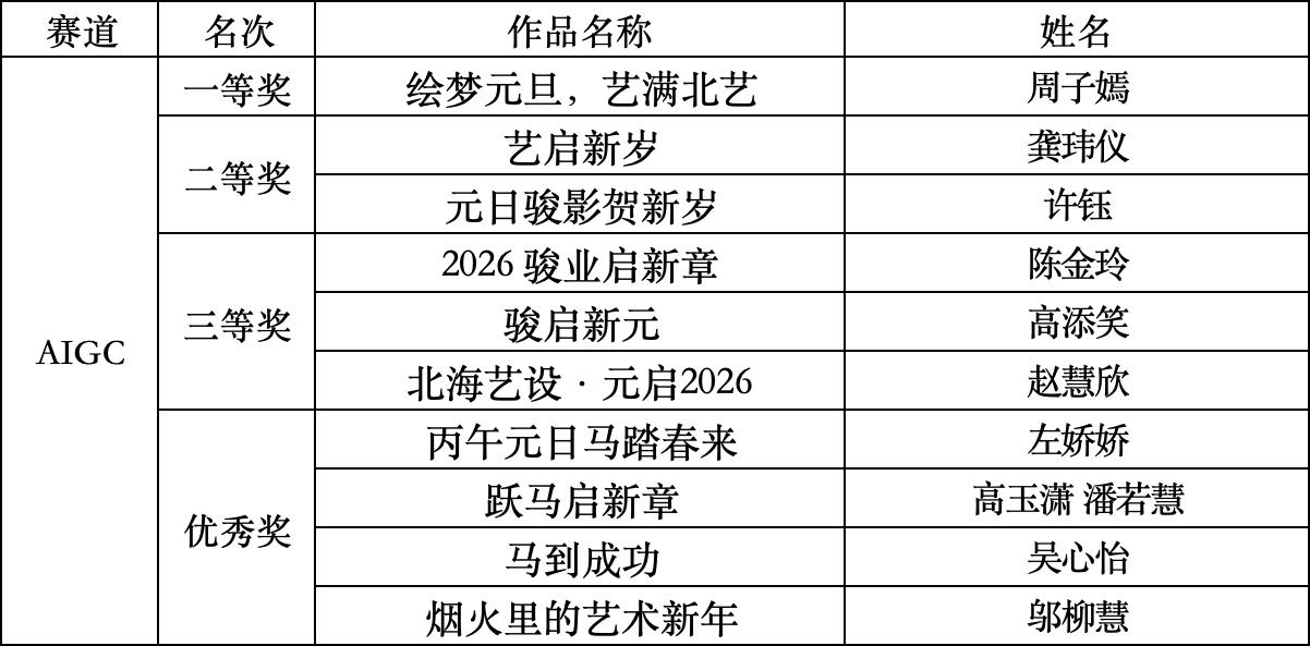 当艺术创作遇上人工智能,会碰撞出怎样的新年火花?近日,由共青团北海艺术设计学院委员会主办、设计艺术学院分团委承办的“以艺术之名,赴新年之约”2026年元旦校园海报设计大赛圆满结束。大赛创新设立纯设计与AIGC双赛道,成为一场传统艺术与前沿科技深度融合的校园文化盛宴。 在新年伊始的浓厚节日氛围中,本次大赛为北艺学子搭建了一个展现才华、激发创意的广阔舞台。大赛秉承公平、公正、专业的原则,经过专家评委的评选,最终评选出各类奖项并予以公示。 此次元旦海报设计大赛,不仅是一次设计技艺的比拼,更是一次将传统文化创造性融入校园文化建设的重要实践。活动极大地丰富了校园文化生活,使元旦的节日氛围更加生动可感。大赛所传递的创新精神与青春活力,也为新一年的校园发展注入了蓬勃能量,激励着全体同学以更加饱满的热情和创造力,迎接2026年的挑战与机遇。