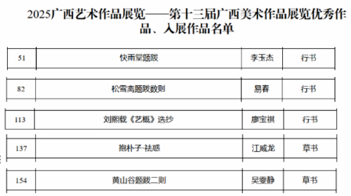 第十三届广西艺术作品展览是由广西壮族自治区人民政府主办,是全区最高水平的艺术作品展览。在2025广西艺术作品展览——第十三届广西书法(篆刻)作品展览中,我校书法学院教师李玉杰、易春、廖宝祺、江威龙,2023级学生吴雯静作品入展。