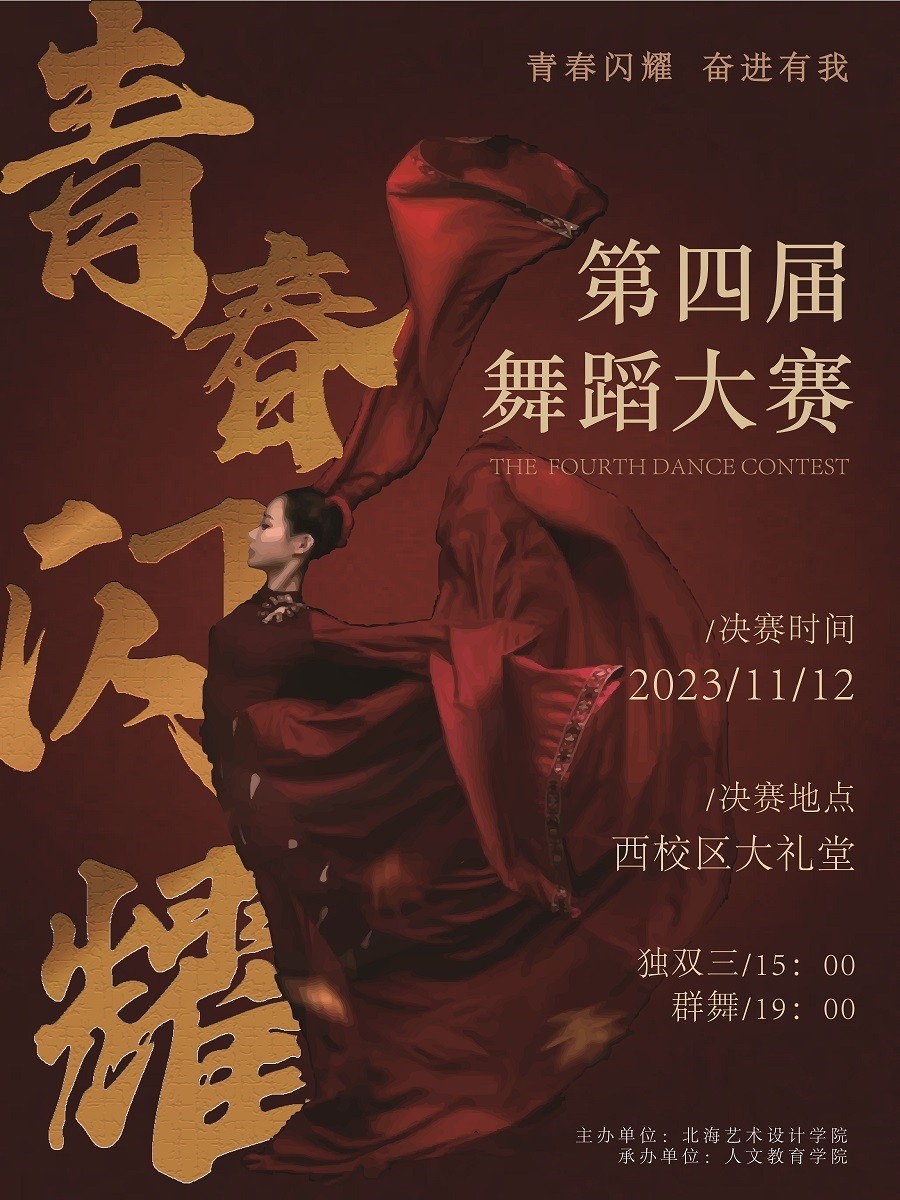 为进一步展示我校大学生的青春风采,激发大学生创新意识和创作能力,在优秀舞蹈作品中讲好故事、表好品质、绽放青春朝气,经研究,决定举办北海艺术设计学院第四届“青春闪耀 奋进有我”校园舞蹈大赛决赛!
