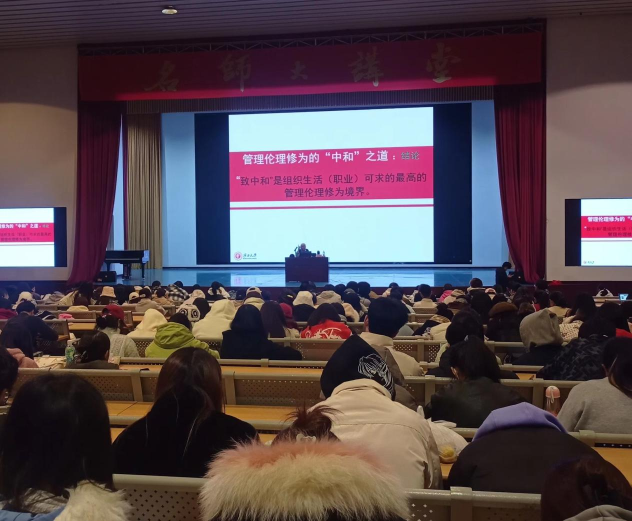 12月18日晚,广西大学公共管理学院王玉生教授应邀于我校西校区大礼堂,为广大师生带来了一场题为《管理伦理修为中的“中和”之道》的精彩讲座。讲座旨在分享管理中的“中和”哲学思想以及人生需要掌握的协调平衡思维。讲座由院长蒙绍荣教授主持。
