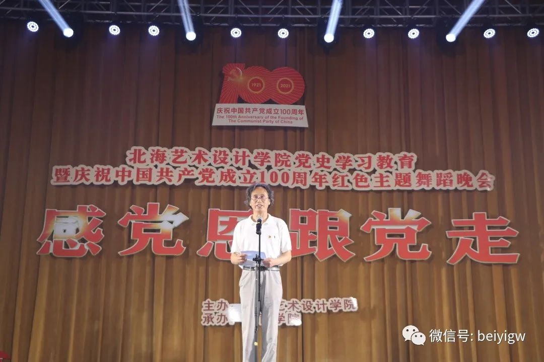 校长卢新华为本次晚会致辞,他指出:在学校党委领导下,我校推出“八展三演”,以优异的教学成果向党汇报,庆祝中国共产党百年华诞。“感党恩跟党走”党史学习教育暨庆祝中国共产党成立100周年红色主题舞蹈晚会,不仅展示了我校师生的教学成果,还将进一步激发我校师生的学史知史爱党爱国情怀,营造我校健康向上、团结奋进的氛围。全校师生以实现北海艺术设计学院第二个20年的发展目标——创办西部一流艺术设计学院和建成民办高校党建典范而努力奋斗。