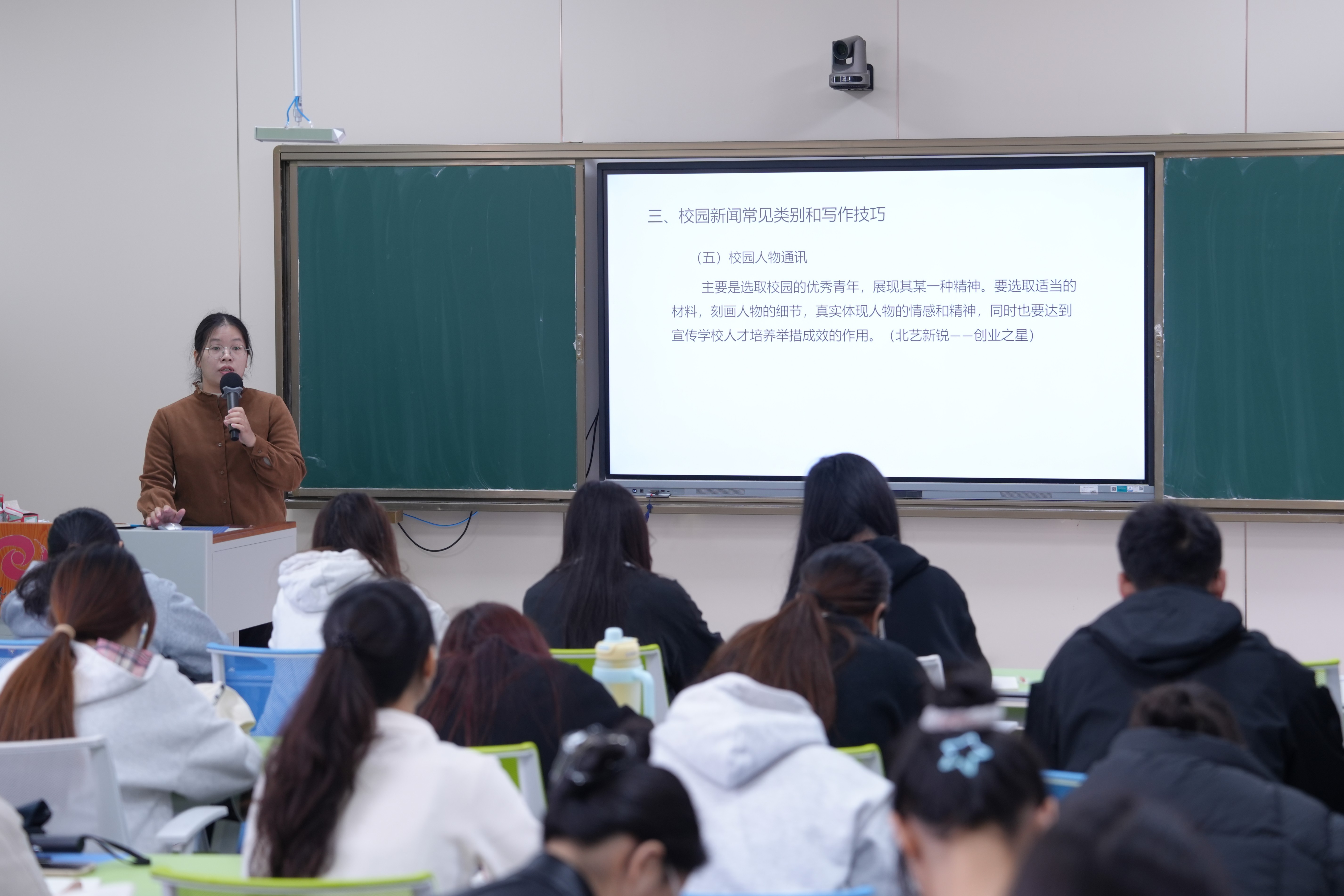 第一节培训课程哲学学院谢佩玲老师以“校园新闻写作技巧”为主题开展授课。谢老师引导学员从新闻的基本定义、核心要素以及规范结构等方面,对新闻展开系统的认知并结合新闻报道案例,讲解校园中常见新闻类别的写作技巧,帮助同学们深入了解了校园新闻写作的相关要求