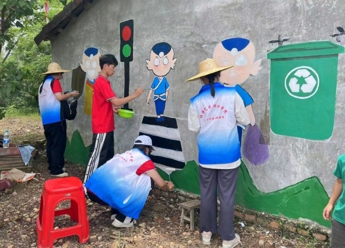 6月16日下午实践活动结束后,在美术学院分团委副书记许荣军老师的带领下,美术学院和各个学院分团委的志愿者们给红锦村村民家中的墙面进行设计与绘画,给枯燥的房子增添了一抹亮丽色彩,为乡村振兴奉献自己的绵薄之力。