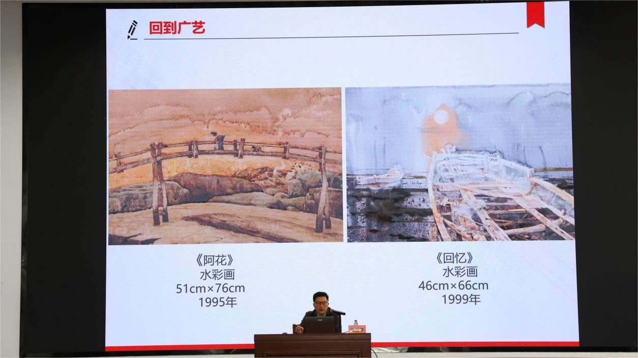 韦俊平教授以自身的画作为例,他通过见证漓江画派的成长助力自己在2015年转型到中国画领域,其间他用详尽的亲历资料向现场师生详细介绍了漓江画派的发展和特点。韦俊平教授还以大量的案例阐述了水彩和国画相互影响、互通共融的特点。他强调,绘画要做到熟能生巧,勤能补拙,在日常学习中多加练习,巩固专业基础的同时不断精进技术水平。