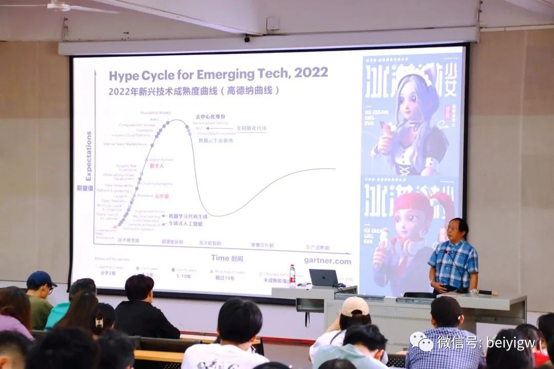 随后,李四达教授从五个方面提出了当下科技艺术设计构成的挑战和发展趋势。第一,人工智能生成技术的挑战引起人们对一个更全面的智能时代艺术与科技的思考,也让大家看到了数字媒体艺术广阔的前景并对这个行业充满了信心与期待。第二,拓展现实的挑战,拓展现实仿真技术催生出全新的生活方式。元宇宙的兴起更预示着虚拟商品的发展前景广阔,李四达教授用多个例子证明元宇宙是真实世界的翻版或延伸,让人们突破物理界限创造可能。第三,虚实共生的挑战,数字孪生与虚拟人技术,将大有可为,成为数字媒体艺术今后发展必须面对的挑战。第四,虚拟产品的挑战由2022年新兴技术成熟度高德纳曲线可以看出,数字人未来发展前途无量,值得期待。第五,大数据美学与文化的思考,新媒体艺术的科技特性创造了一种互交的、对话式的观看方式,突出艺术作品的“对话性”和观察者的参与感。李四达教授表示,现当下新媒体艺术在行为层与文化层的深度设计仍有不足,他通过奥拉维尔·埃利亚松的代表作《气候计划》,启迪大家要把行为层与文化层的思想与观念融入作品创作。