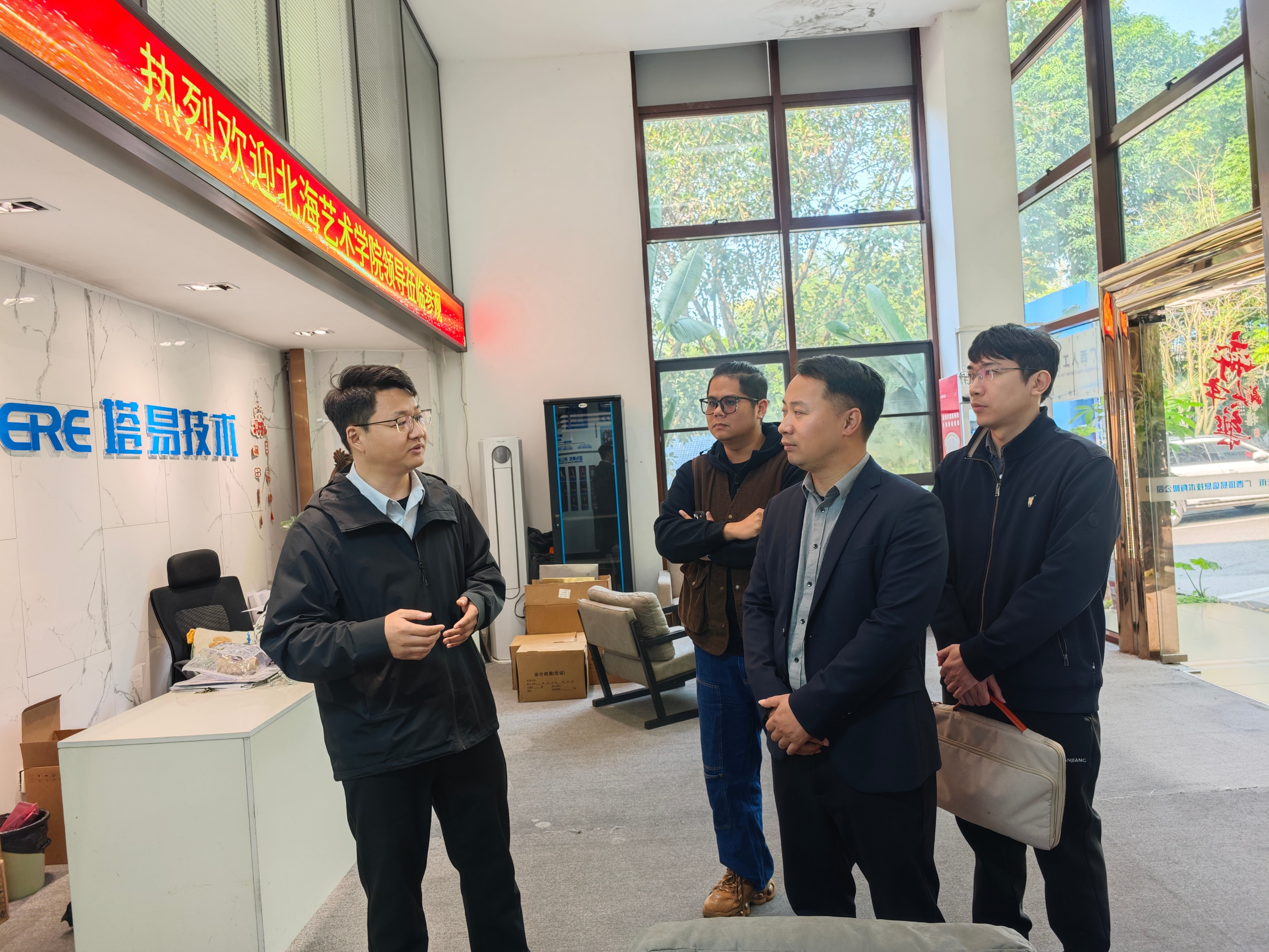 为进一步深化产教融合、校企合作,精准对接企业人才需求,优化专业人才培养方案,扎实推进学生实习就业工作,2026年3月11日,造型艺术学院院长邓渠成、副院长胡毅、钟远诚及产品设计教师周劲志一行赴南宁市开展“访企拓岗促就业”专项调研工作,先后走访广西塔易信息技术有限公司、广西御城广告策划有限公司、广西美斯达工程机械设备有限公司,与企业负责人深度交流探讨,共探人才培养路径,共谋校企合作新篇。