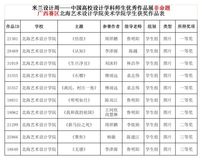 我校美术学院在教学中秉承道德为本,艺术求精的教学理念,坚持以赛促学、以赛促教,注重全方位育人。积极鼓励师生参加各类专业比赛。近日,第六届米兰设计周高校设计展省赛评审工作已全部结束,在全国33个赛区共计3万余件参赛作品中,我校美术学院参展学生作品在广西赛区脱颖而出,共获得一等奖5名,二等奖3名,三等奖2名。