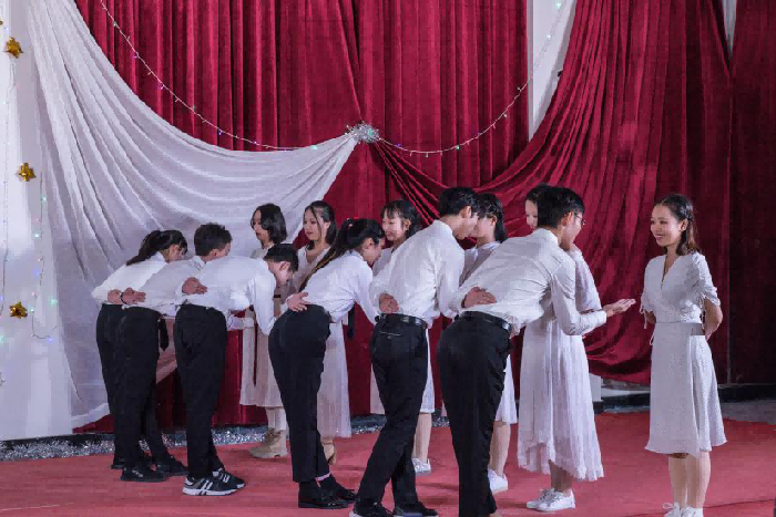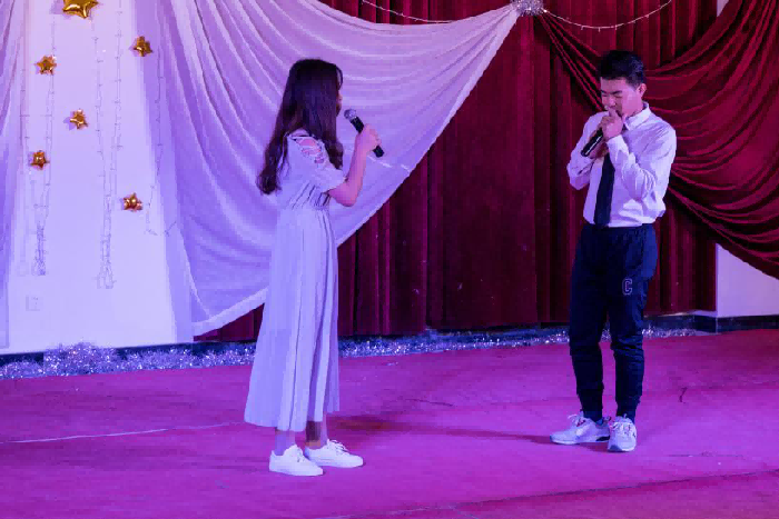 今晚将会是一个精彩纷呈的夜晚。首先是我们的主持人宣布今天的晚会正式开始,并依次介绍我们此次出席的晚会嘉宾。先是由动画学院1812班为我们带来一场爱的华尔兹,音乐想起,顿时点燃了全场同学的热情,下面观众为他们疯狂鼓掌。