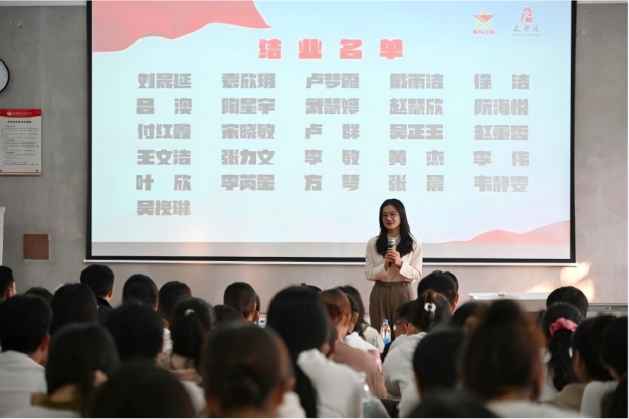 随后,岳莹书记作总结发言。她在回顾本期培养目标达成情况的同时,也对全体学员在培训期间的成长给予了充分肯定。她强调,青马工程的结业不是终点,而是学员们践行马克思主义精神、投身社会实践的新起点。发言结束后,岳书记宣读了结业名单,并邀请陈渤水院长上台,为结业学员颁发证书。