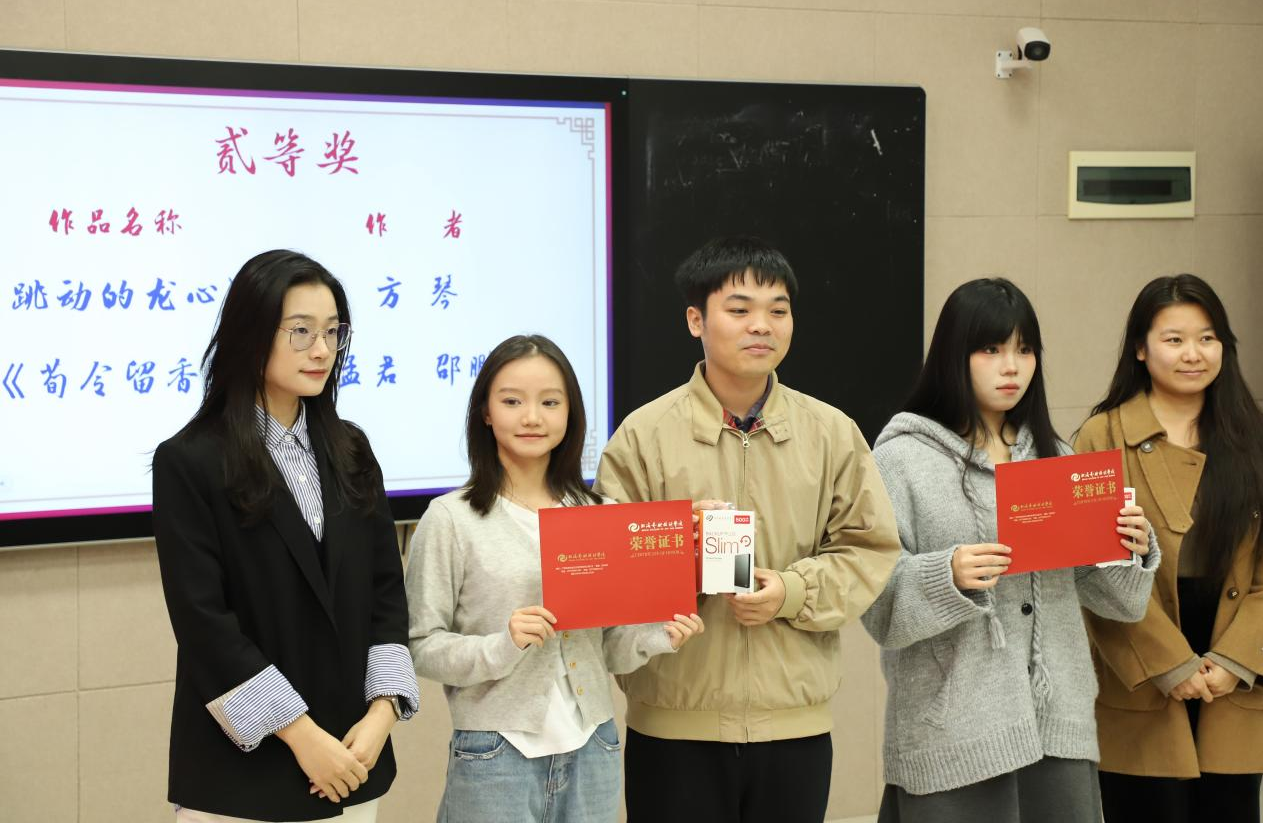 活动伊始,主持人详细阐释了本次剧本征集大赛的举办宗旨——以文字为媒搭建戏剧创作交流平台,挖掘校园戏剧创作新力量。随后,伴随着热烈的掌声,获奖名单正式揭晓,参会嘉宾和教师依次为获奖学子颁发荣誉证书。