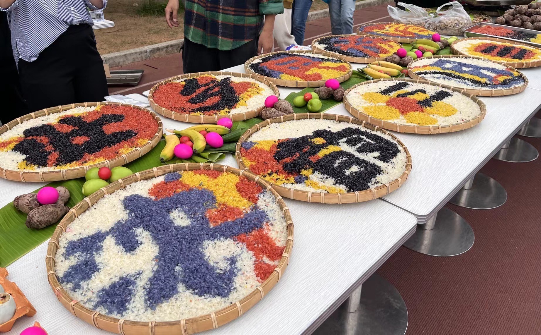 当天,学院师生身着各民族服饰,佩戴精美的配饰,通过民族舞蹈、民族歌曲、民族服装走秀等节目让在场师生“沉浸式”感受到壮乡儿女的独特与风情。此外,还举办了民族文化体验活动,学院师生参加了民族体育竞技、民族美食体验、民族手工艺品展示等活动。现场参与抛绣球、竹竿舞、背篓绣球、溜铁环旱地龙舟、手工绣球制作等民族活动,品尝了具有壮乡特色的民族美食,五色糯米饭、艾叶糍粑、彩蛋等,欣赏到了琳琅满目的民族手工艺品,尽显壮家儿女心灵手巧和热情好客,展现了八桂人民的幸福生活,给现场的师生带来了一场视听盛宴。