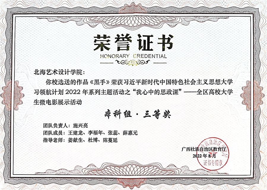 经全区各高校初选推荐,自治区教育厅组织专家评审,认定了“我心中的思政课”全区高校大学生微电影展示活动优秀作品101部,其中,我校马克思主义学院、动画与传媒学院依托合作共建的思政课实践教学研习基地“红色影视创作室”,组织指导学生创作的作品《登台亮相》《黑手》分别获得“我心中的思政课”——全区高校大学生微电影展示活动本科组二等奖、三等奖。